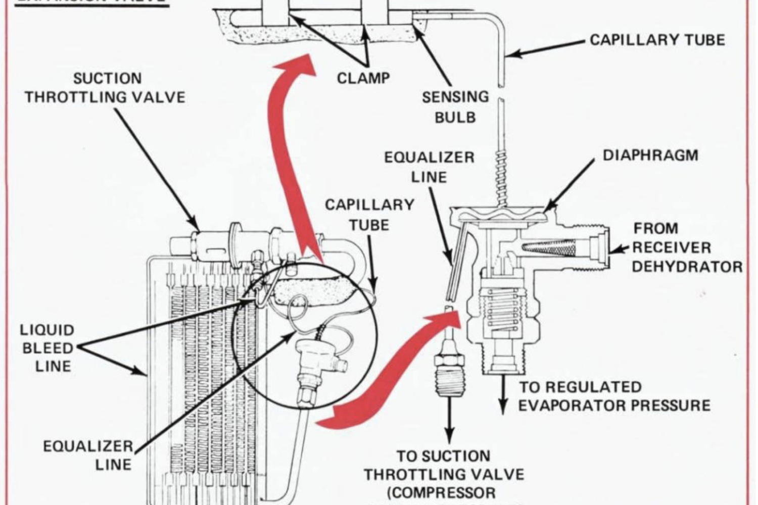 Expansionsventil, Verdampfer und STV mit Druck-Ausgleichsleitung (Equalizer Line) und Öl-Bypass-Leitung (Oil Bleed Line bzw. hier Liquid Bleed Line genannt)